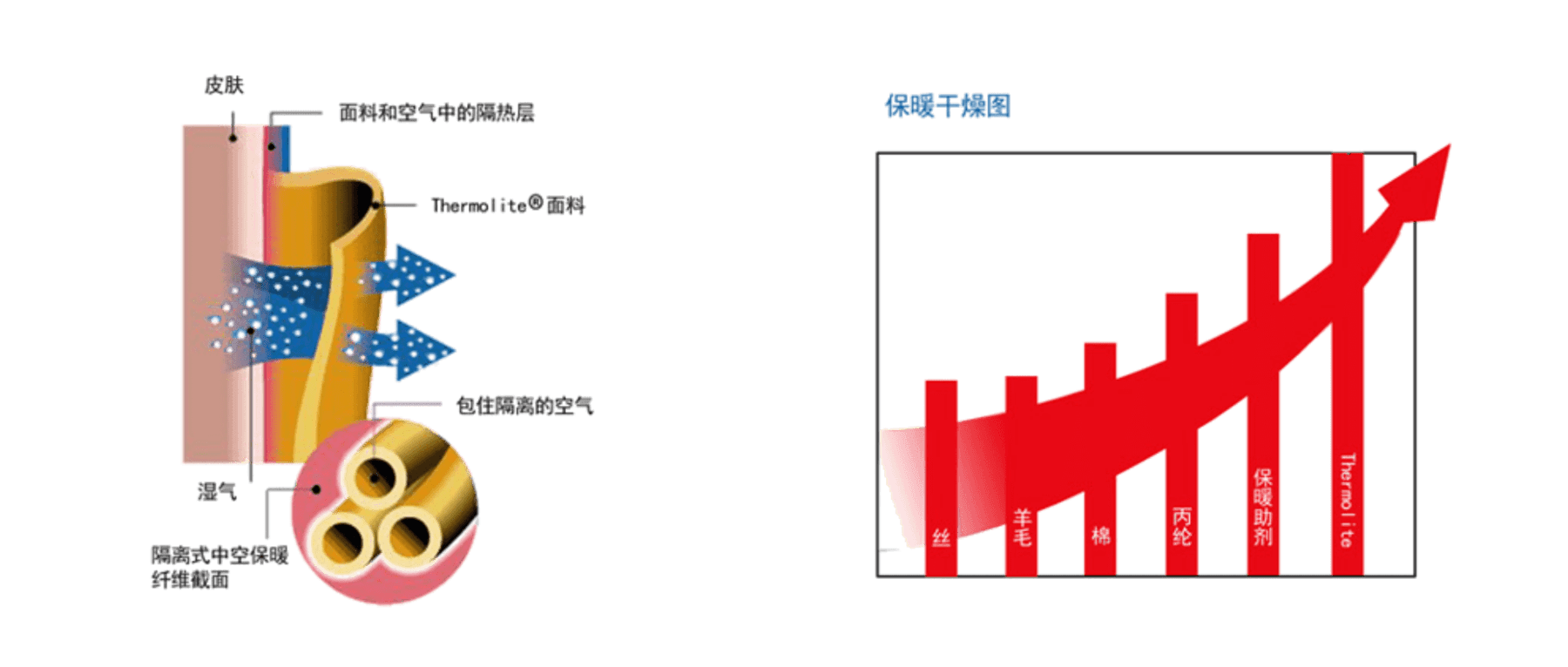 THERMOLITE?采用“隔離式保暖”設(shè)計(jì)。它仿造北極熊毛的中空特殊結(jié)構(gòu),可在寒冷的天氣里保持溫暖,即使在濕狀態(tài)下也具有保暖和舒適、輕盈的感覺(jué)。